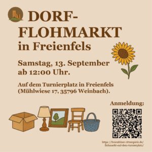 Am 13. September findet auf dem Turnierplatz in Freienfels ein Dorf-Flohmarkt statt. Der Flohmarkt beginnt um 12:00 Uhr und dauert bis in den späten Nachmittag. Auf dem weitläufigen Gelände haben zahlreiche Teilnehmende aus Freienfels und der Umgebung ausreichend Platz, ihre Waren anzubieten. Jeder Standplatz bietet die Möglichkeit, das eigene Auto direkt hinter dem Stand zu parken. Der Förderverein zur Erhaltung der Burgruine Freienfels sorgt für die kulinarische Versorgung – auch bis in die Abendstunden hinein. Interessierte können sich >> hier << registrieren.